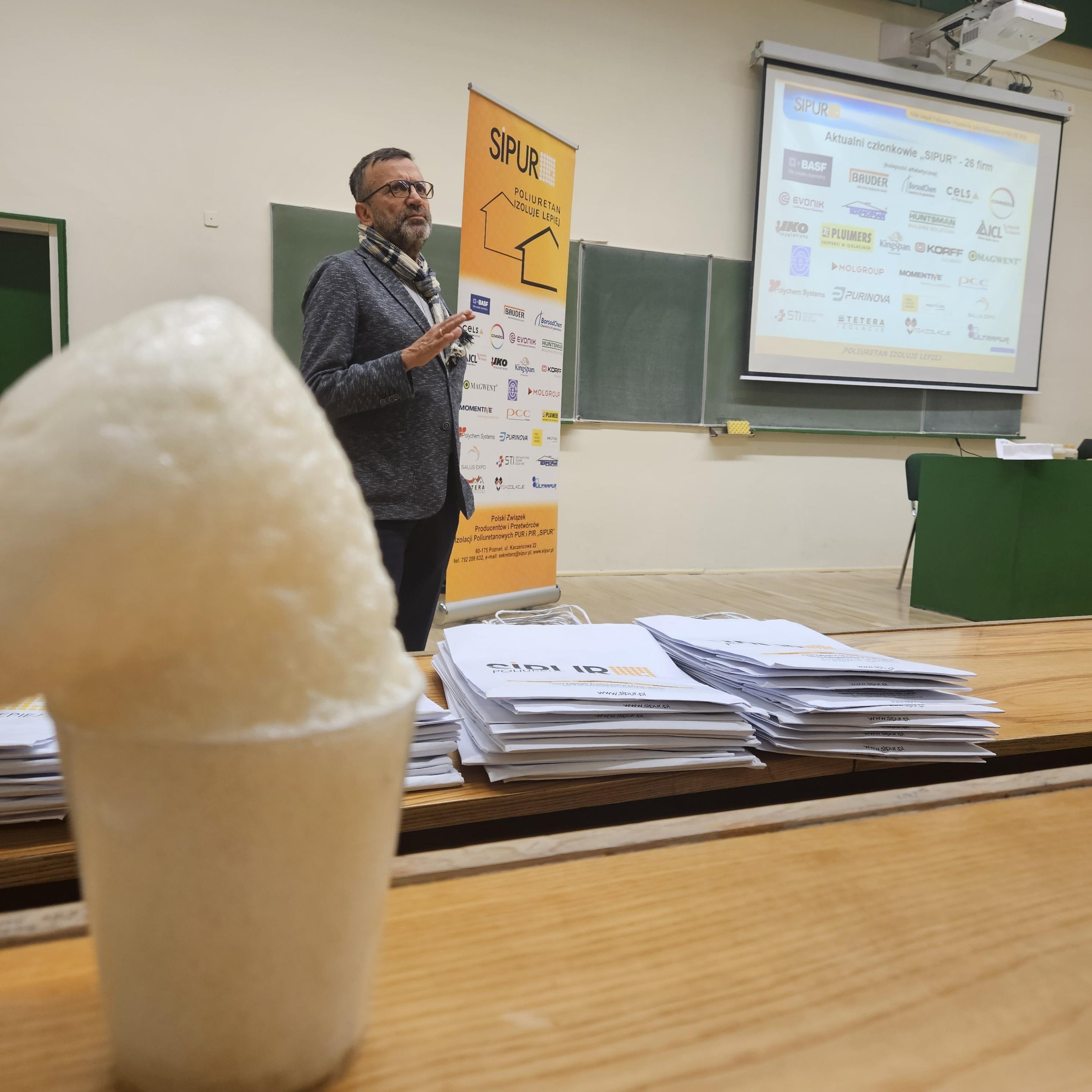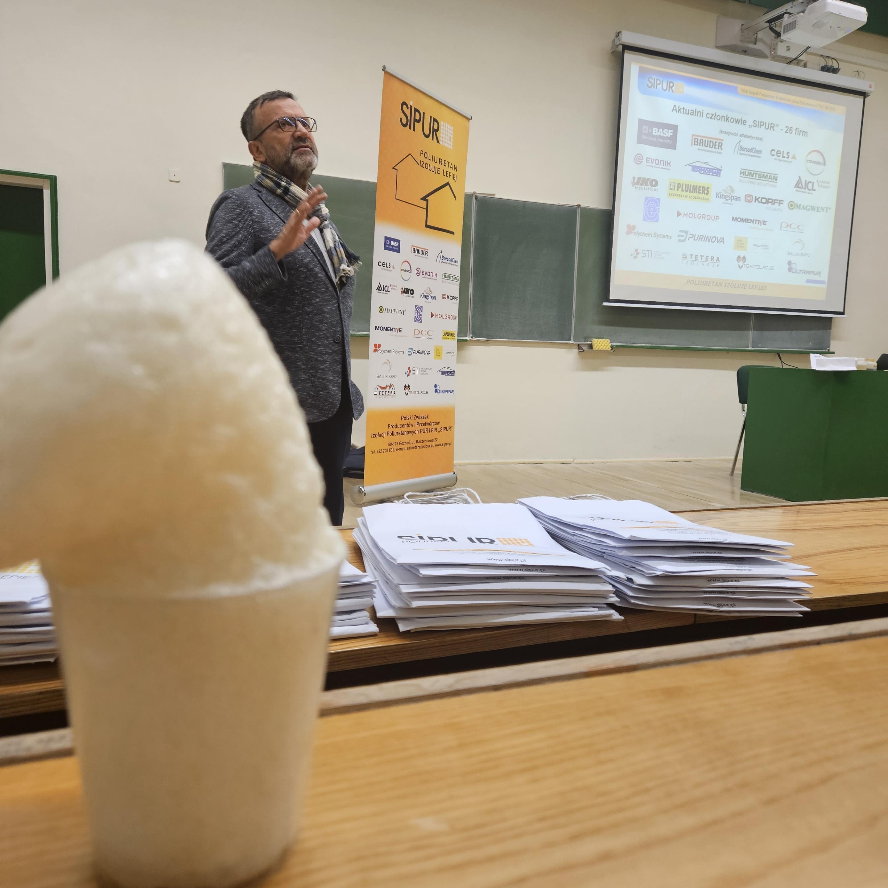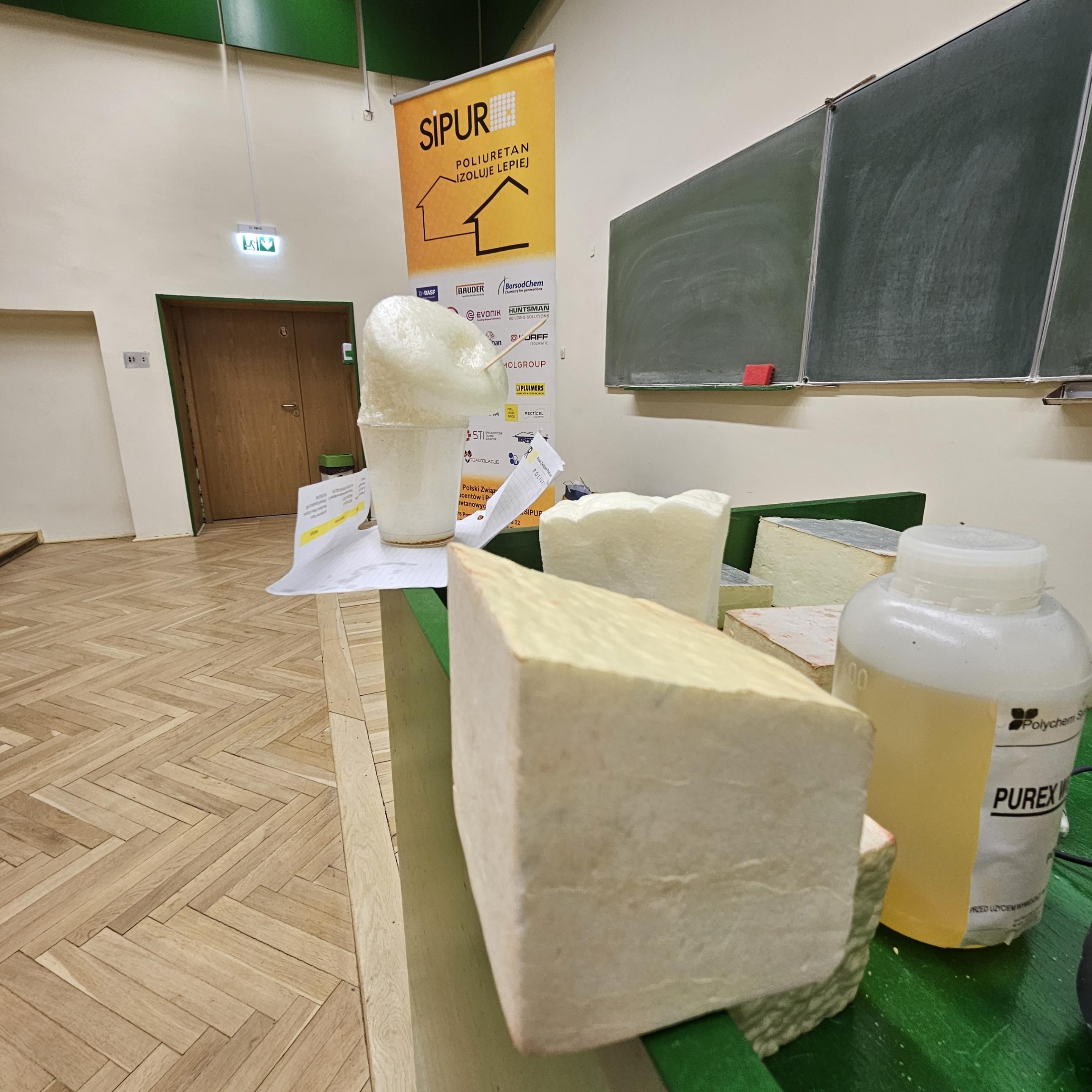 Uczestnicy mieli wyjątkową okazję nie tylko zdobyć wiedzę teoretyczną, ale również doświadczyć jej w praktyce. Studenci mogli dotknąć i porównać różne rodzaje materiałów izolacyjnych, takich jak pianka poliuretanowa zamkniętokomórkowa i otwartokomórkowa, a także na żywo zobaczyć, jak błyskawicznie – w wyniku połączenia odpowiednich substancji – powstaje gotowy materiał.